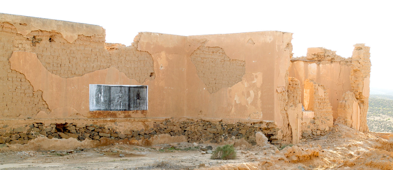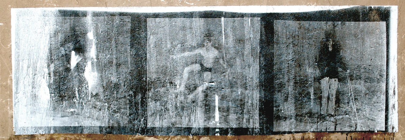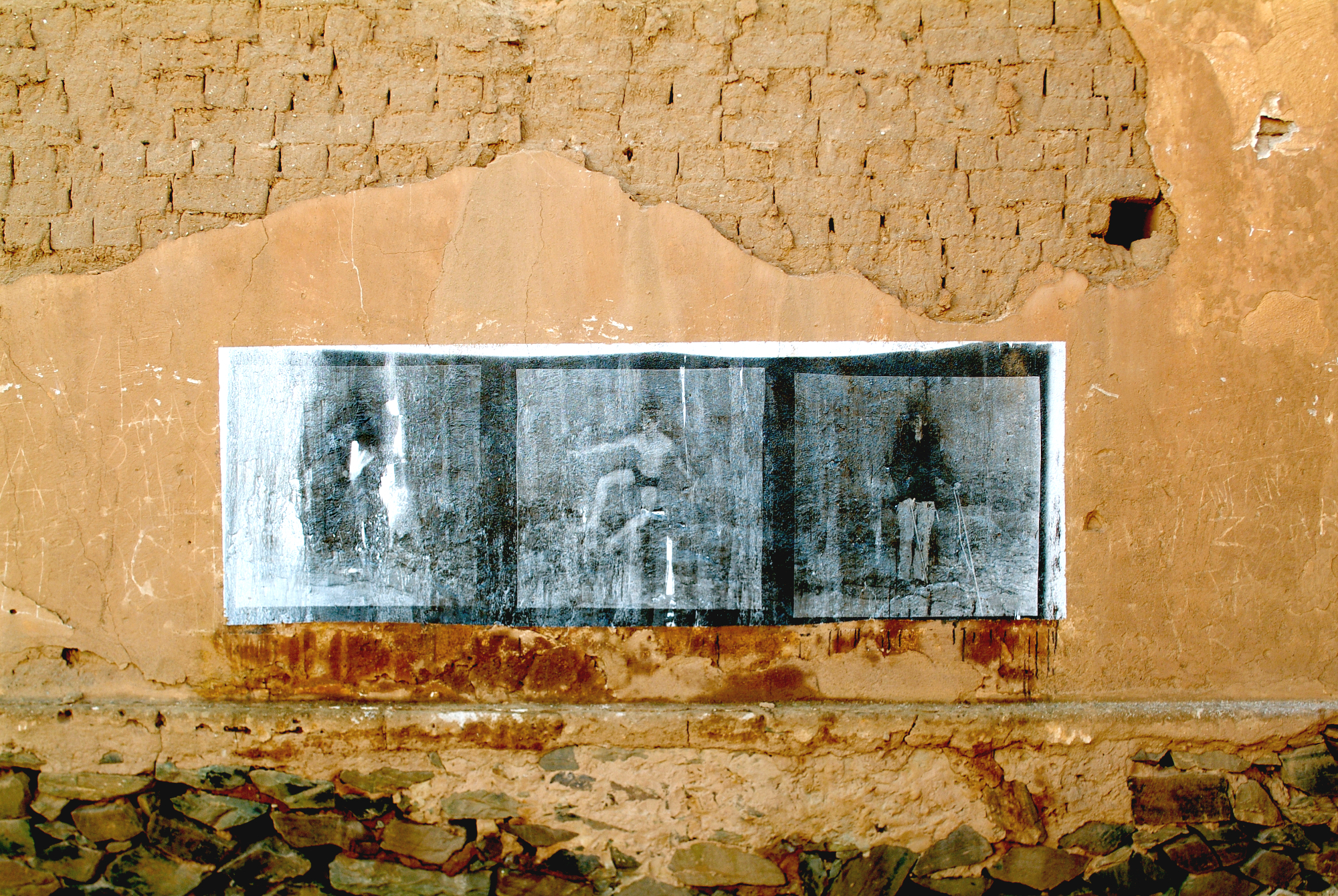 I coated the wall with light sensitiv emulsion , exposed the b/w negs using my large format camera as a projector, and sprayed the chemistry for developing and fixing, plus a lot of water onto it.